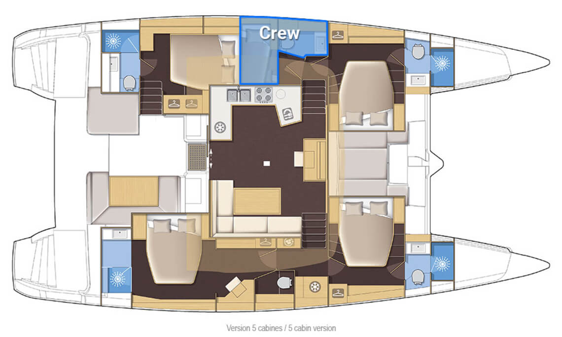 The catamaran has four luxurious suites (one of which, the owner's, is a premium suite that is more spacious and comfortable); all have large beds, 160 cm wide, full bathrooms, and independent air-conditioning, and the catamaran comes with all of the extras that Lagoon provides its boats of this category, to make the journey even more comfortable and safe