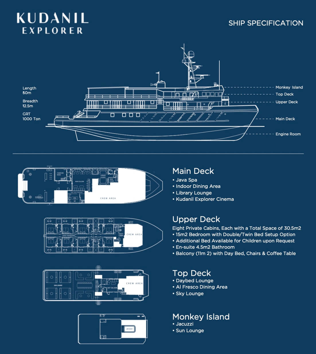 The KUDANIL EXPLORER features eight luxurious suites, all of which have the same size and layout. The first yacht in Indonesia with private balconies in each cabin, these private areas with day beds provide an added degree of relaxed elegance to the aboard experience, while her stability and safety provide peace of mind on even the most daring and unusual of expeditions.
