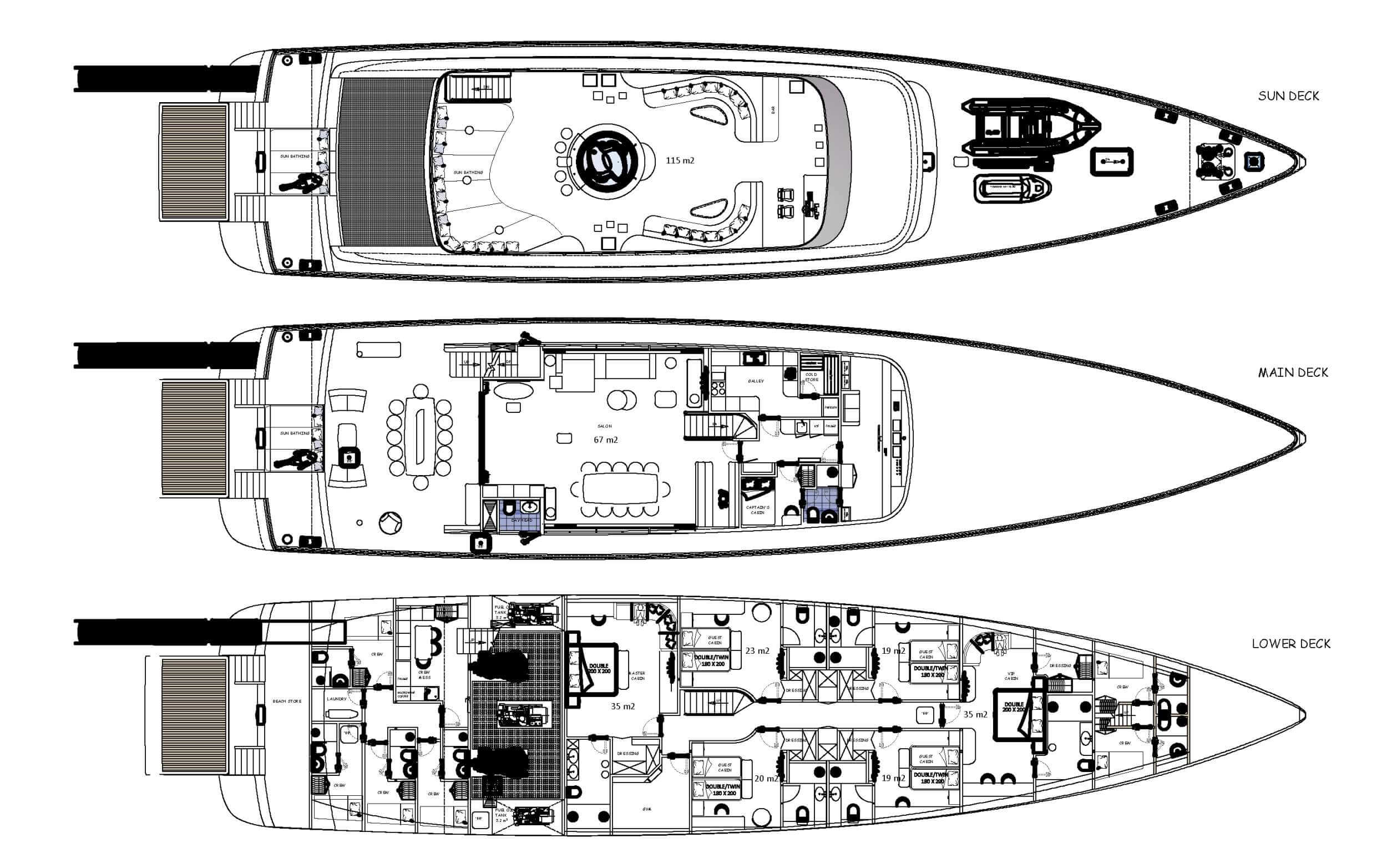 The sundeck, adorned with an eight-person Jacuzzi and expansive sun loungers, is the perfect locale to bask in late-afternoon sunshine with a glass of bubbly in hand. Covered with sun tents, the sundeck transforms into an open living room suitable for sunset cocktails, themed parties, and starlit movie nights, with the screen mounted on the mast. Gym equipment can be moved from the lower deck to the sundeck, allowing you to benefit from the sea air during your workout.