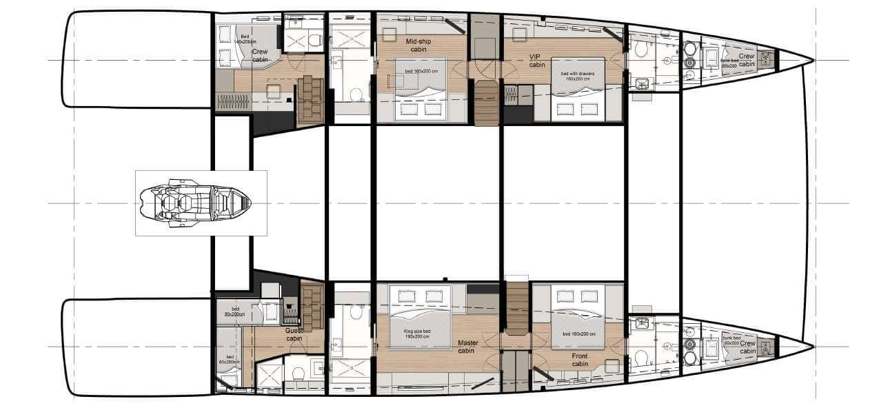 NAUTI NICKEL offre une expérience inoubliable de charter dans les Caraïbes, alliant élégance, espace et luxe de haut niveau. Lancé en 2023, ce catamaran de 80 pieds avec une largeur de 40 pieds est conçu pour offrir un confort ultime, accueillant jusqu'à 10 invités avec un équipage dévoué de quatre personnes assurant un service impeccable. Le flybridge est une caractéristique remarquable, offrant deux espaces ouverts pour s'asseoir, une télévision, un bar, un grill et un jacuzzi—parfait pour recevoir ou se détendre. Un réfrigérateur bien rempli, une machine à glaçons et de l'eau de Seltz à volonté permettent d'avoir des rafraîchissements à portée de main, tandis qu'un bimini offre de l'ombre ou un éclairage d'ambiance pour les cocktails du soir. Le vaste coussin du salon arrière est un endroit idéal pour prendre un bain de soleil ou se détendre, avec des vues panoramiques à couper le souffle. Le pont arrière comprend une élégante salle à manger formelle et des espaces de détente cossus, créant ainsi une retraite sereine. À l'intérieur, le salon accueille les invités avec un décor urbain chic, une sellerie en cuir et un bar rétroéclairé sur mesure. Une deuxième salle à manger, un coin café confortable et une cuisine ouverte équipée d'appareils électroménagers de pointe rehaussent l'expérience à bord. Profitez d'un café gourmet fraîchement moulu, d'un lait moussé par des experts et d'un vin parfaitement réfrigéré grâce à deux refroidisseurs intégrés. Pour les amateurs d'aventure, Nauti Nickel dispose d'une vaste sélection de jouets nautiques, dont un jet ski, des eFoils, des SeaBobs, du matériel de plongée avec tuba, des kayaks, des paddleboards, des wakeboards, des skis nautiques, un nénuphar flottant et des structures gonflables remorquables. Avec un équipage qualifié et attentif qui se consacre à l'élaboration d'un voyage extraordinaire, Nauti Nickel est le catamaran de luxe ultime pour une évasion en mer sans précédent.
