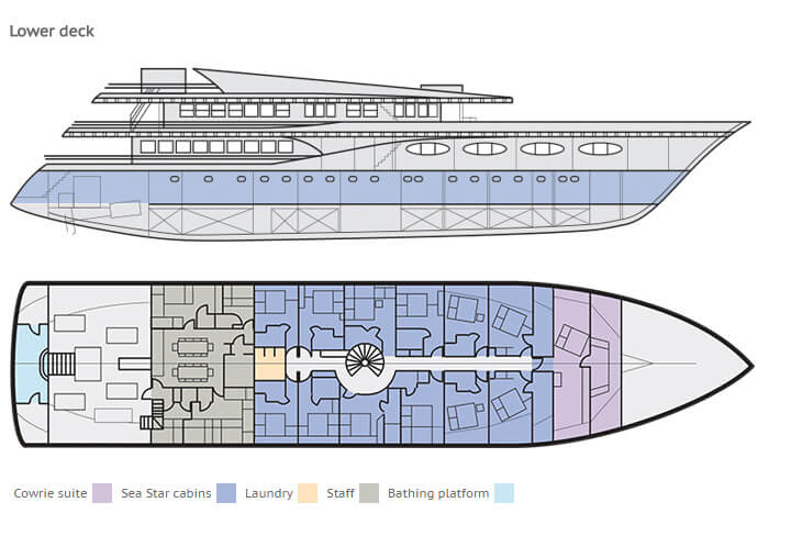 Ces tarifs sont indicatifs, pour une occupation double dans une suite Manta, et sont soumis à des frais de service et d'administration de 10 %. Des frais de parc national, des frais de clearance portuaire et une taxe environnementale peuvent s'appliquer conformément aux réglementations locales. Une TVA de 12 % et une taxe verte de 6 USD par personne et par nuit s'appliquent.