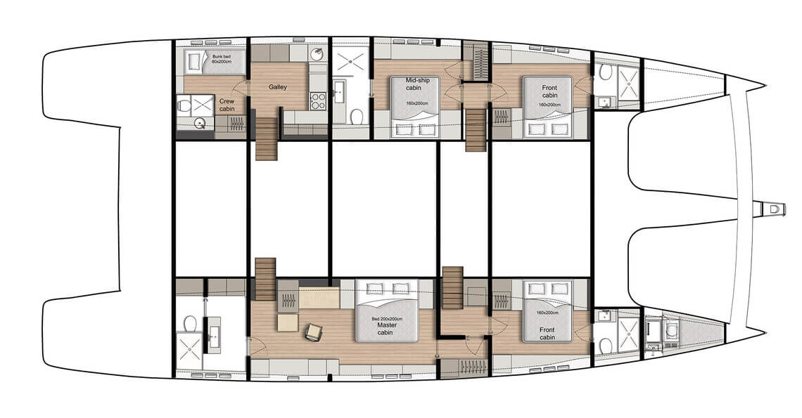 Sunreef 80 X7 Split ha una camera da letto principale e tre spaziose cabine doppie, che lo rendono ideale per quattro coppie o per un viaggio a vela con la famiglia. L'intero ponte principale è stato unito per creare un'unica grande stanza, permettendo ai visitatori di viaggiare facilmente tra il salone e il pozzetto. Questo catamarano di lusso può competere con gli hotel esclusivi di prima classe in termini di comfort nel salone e nelle cabine.