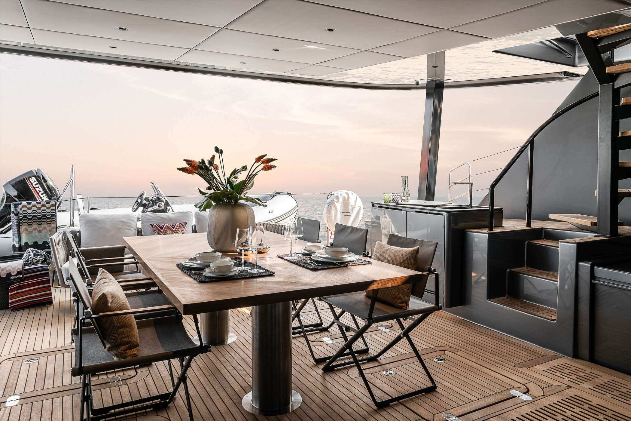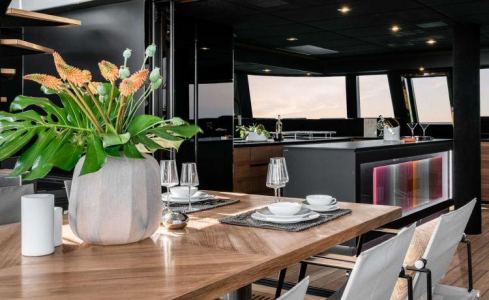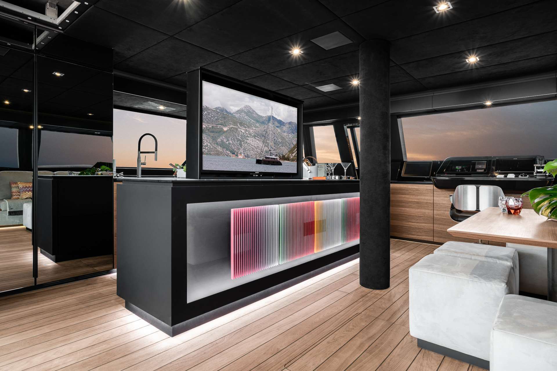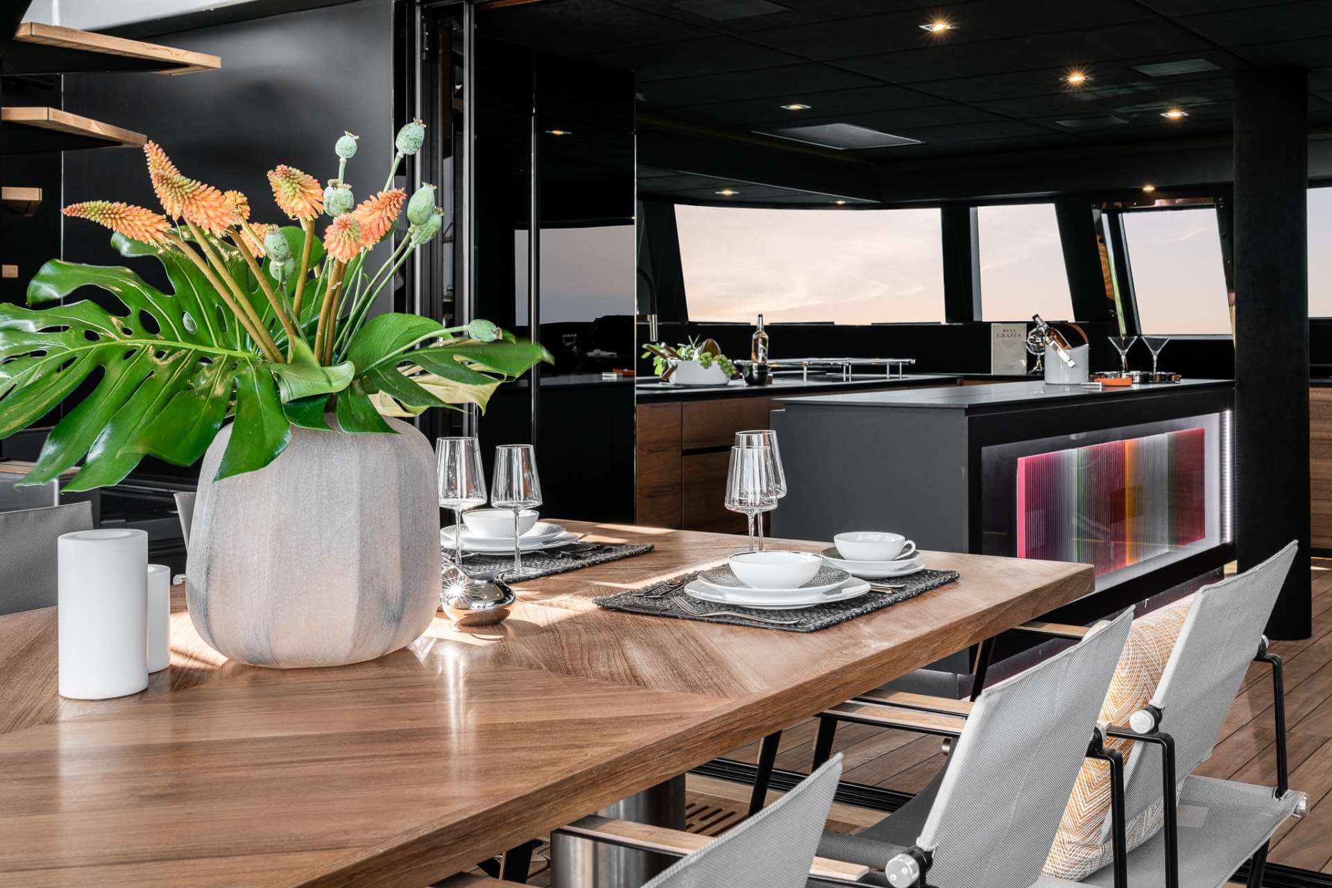 Per un facile intrattenimento, il ponte di poppa confluisce nel salone. Le zone pranzo e lounge sono situate direttamente di fronte alla cucina dello chef, permettendo ai clienti di osservare la creazione dei loro meravigliosi pasti. Per il piacere degli ospiti, una TV a schermo piatto high-tech spunta dal piano del tavolo.