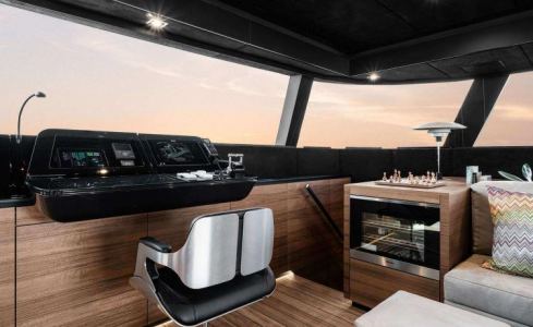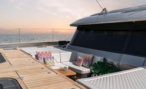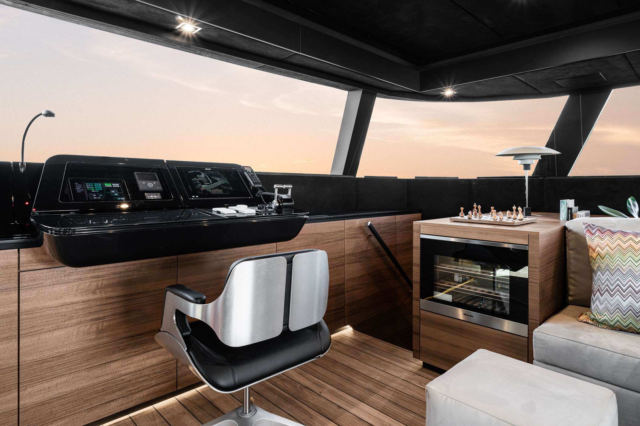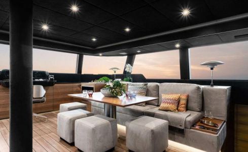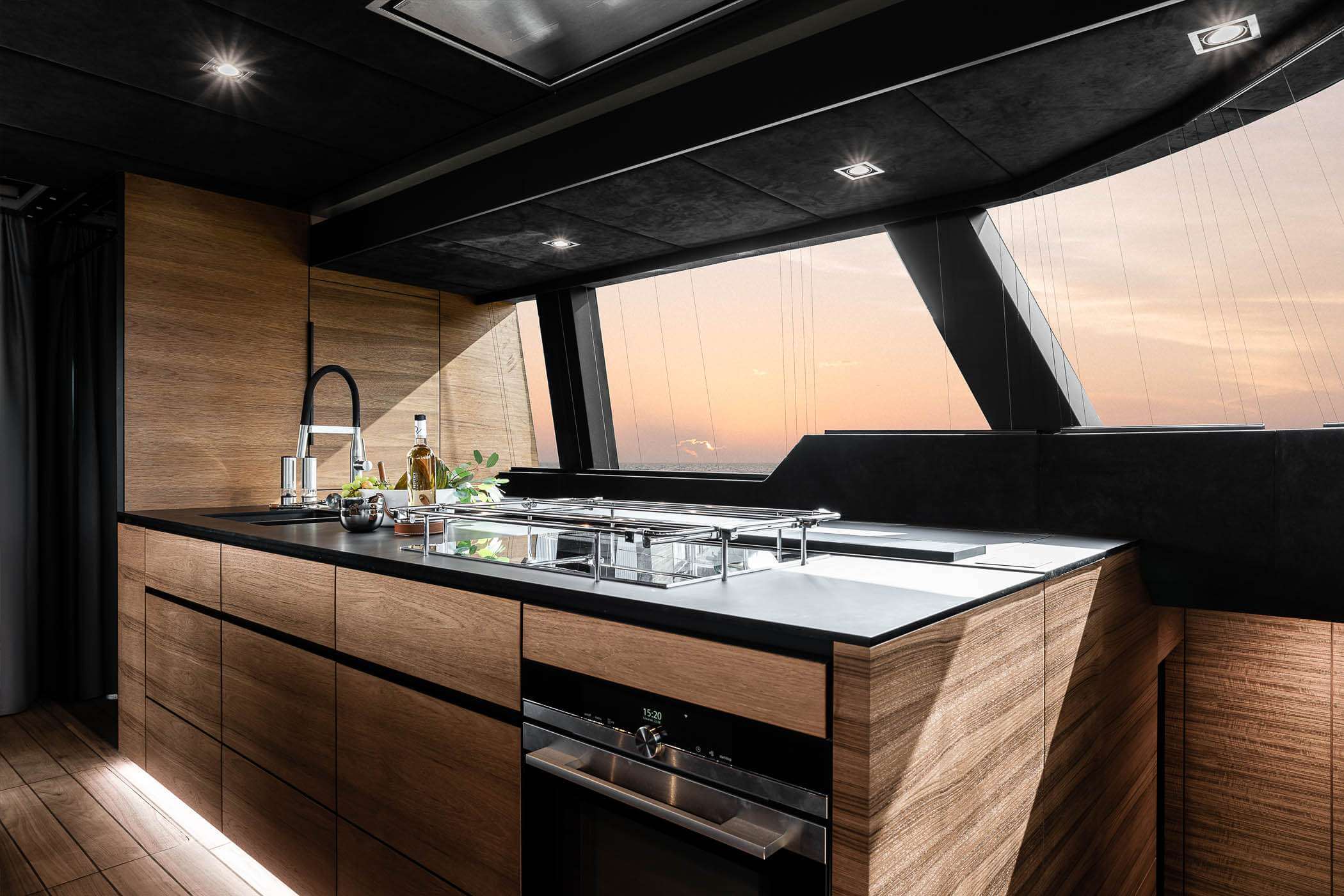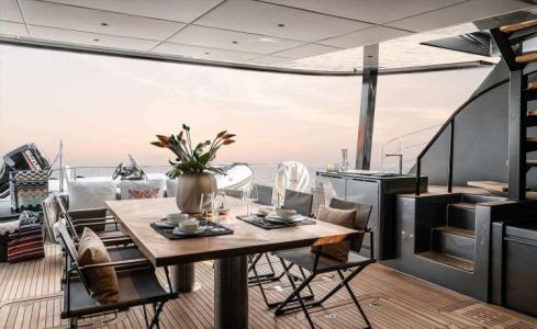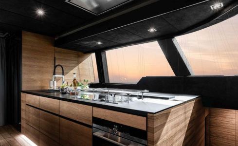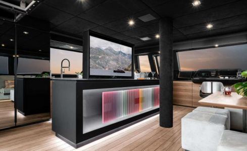 Per un facile intrattenimento, il ponte di poppa confluisce nel salone. Le zone pranzo e lounge sono situate direttamente di fronte alla cucina dello chef, permettendo ai clienti di osservare la creazione dei loro meravigliosi pasti. Per il piacere degli ospiti, una TV a schermo piatto high-tech spunta dal piano del tavolo.