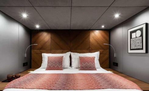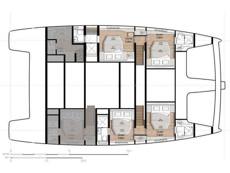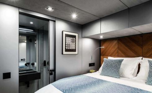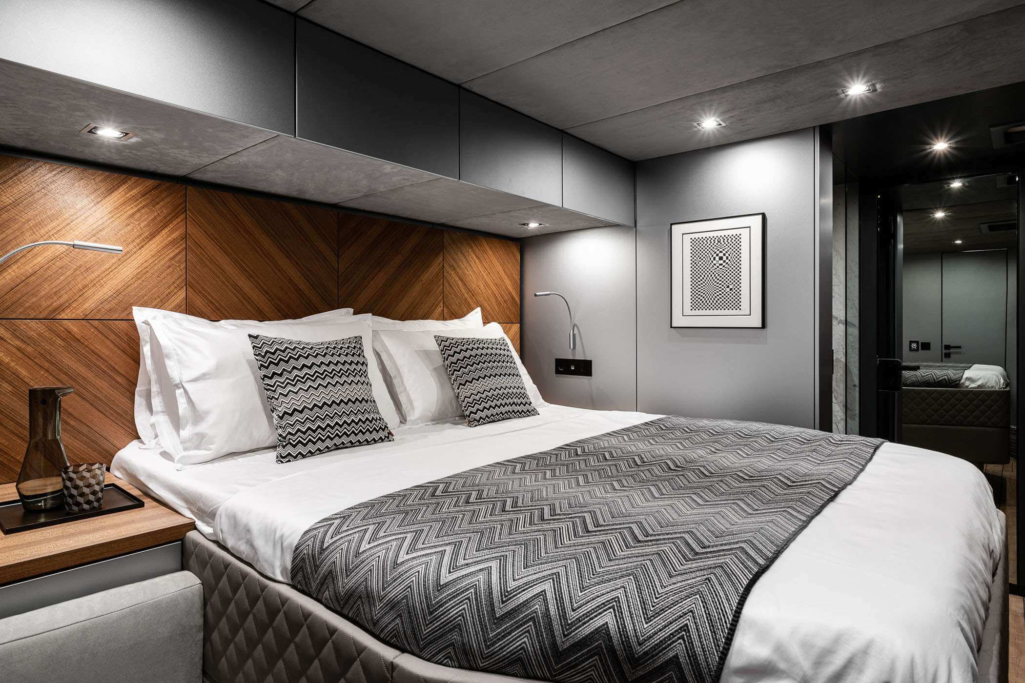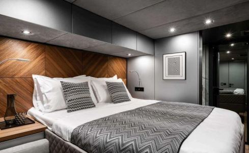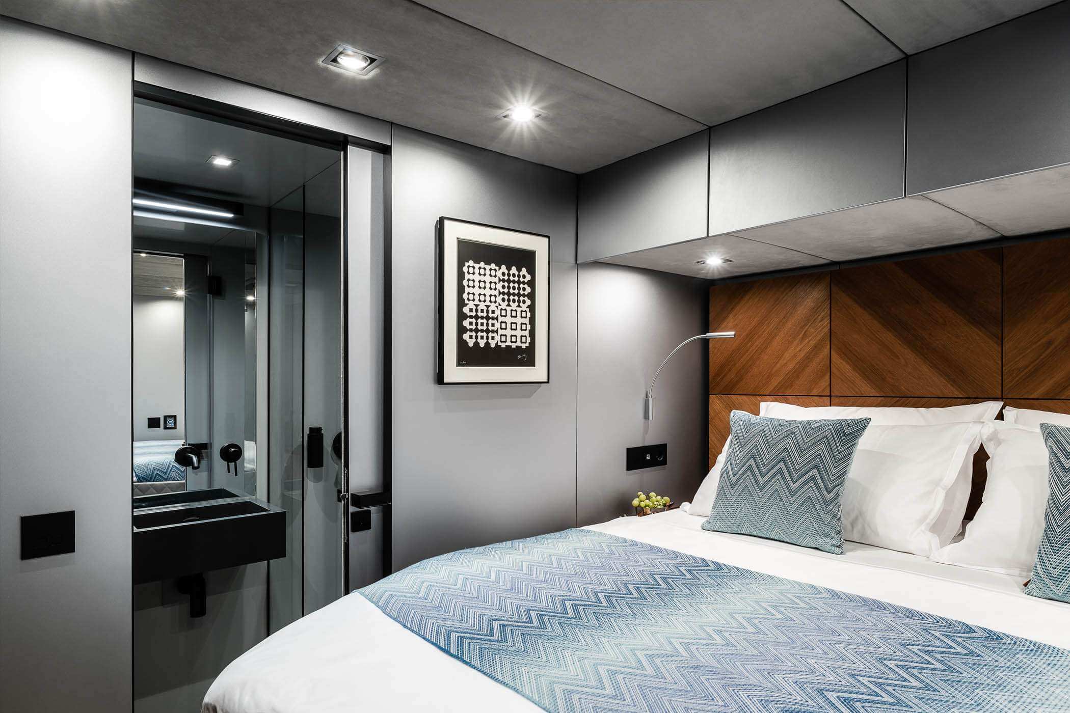 Pavimenti in teak birmano e marmo di Carrara, accentati da una tavolozza alla moda e rilassante di toni blu scuro e grigio metallico, titanio, fibra di carbonio, e molte altre finiture a 5 stelle, tutte provenienti da fonti sostenibili, adornano i vasti interni.